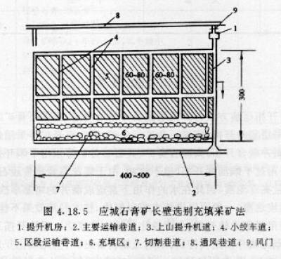 纤维石膏的硬度小,其岩石坚固性系数:平行纤维时f=1.2,垂直纤维时f=1.5,且性脆,容易变成粉矿而损耗。由于矿石价格较高,国内的主要纤维石膏矿多采用长壁选别充填采矿法。选别落矿开采炮眼不得布置在纤维石膏带上,割岩机不能在纤维石膏带中掏槽,落矿后在工作面人工选别,将矸石充填在采空区,矿石装入矿车。图为应城石膏矿采用的沿倾向推进的长壁选别充填采矿法。在6个小区内轮流进行割岩机掏槽、打眼爆(敏感词)破、充填、装矿、运输等工序,工作面工人的工效为1.08t/(工·班)。矿块生产能力为150~220t/d。
