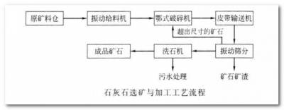 根据石灰窑煅烧工艺的要求,纳米及轻质碳酸钙生产用人窑原料石灰石的粒度为80~150mmm,质量较好的矿石,只需对矿石进行简单的破碎和筛分分级,对含黏土或泥团的矿石,破碎后还需再进行洗矿,去除泥土、杂质后即可得到合格产品。目前较为先进的纳米及轻质碳酸钙生产厂家其石灰石的选矿与加工均已实现机械化。其生产流程见下图。